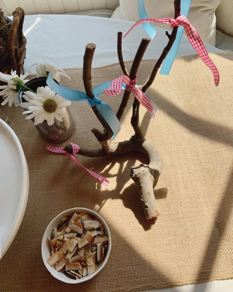 - Rustic baskets, daisies in a tin can, ribbons tied on branches (has to do with the story!)
